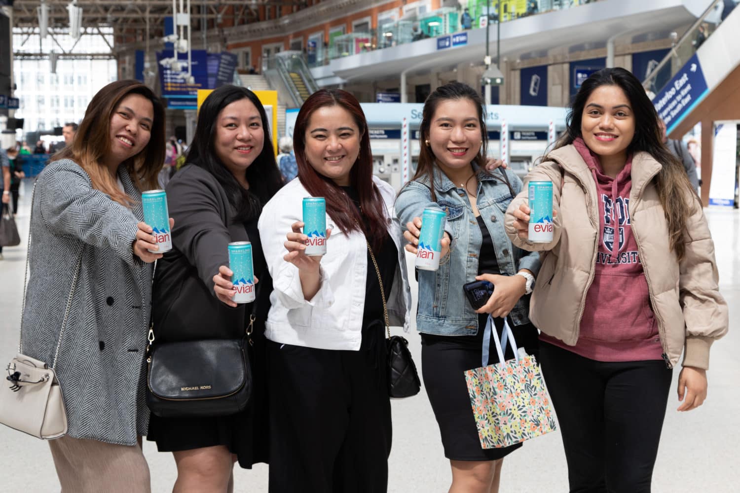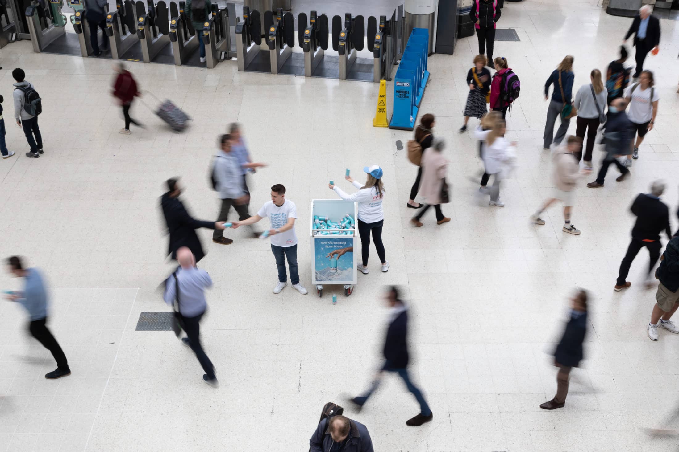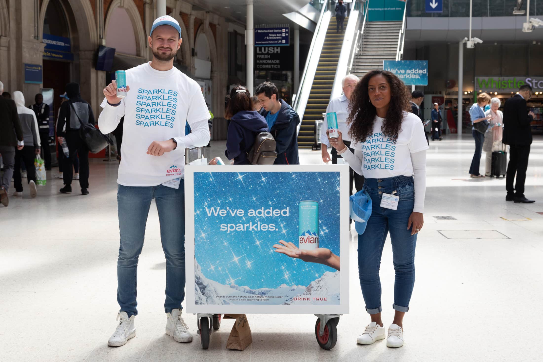 We activated in high footfall locations between May and July sampling chilled cans of evian sparkling water, refreshing consumers at mainline trains stations, central London areas such as Soho and city parks, and finally in the queue at Wimbledon Tennis Championships.